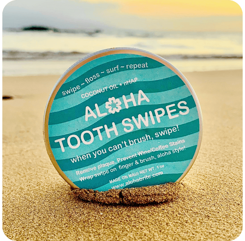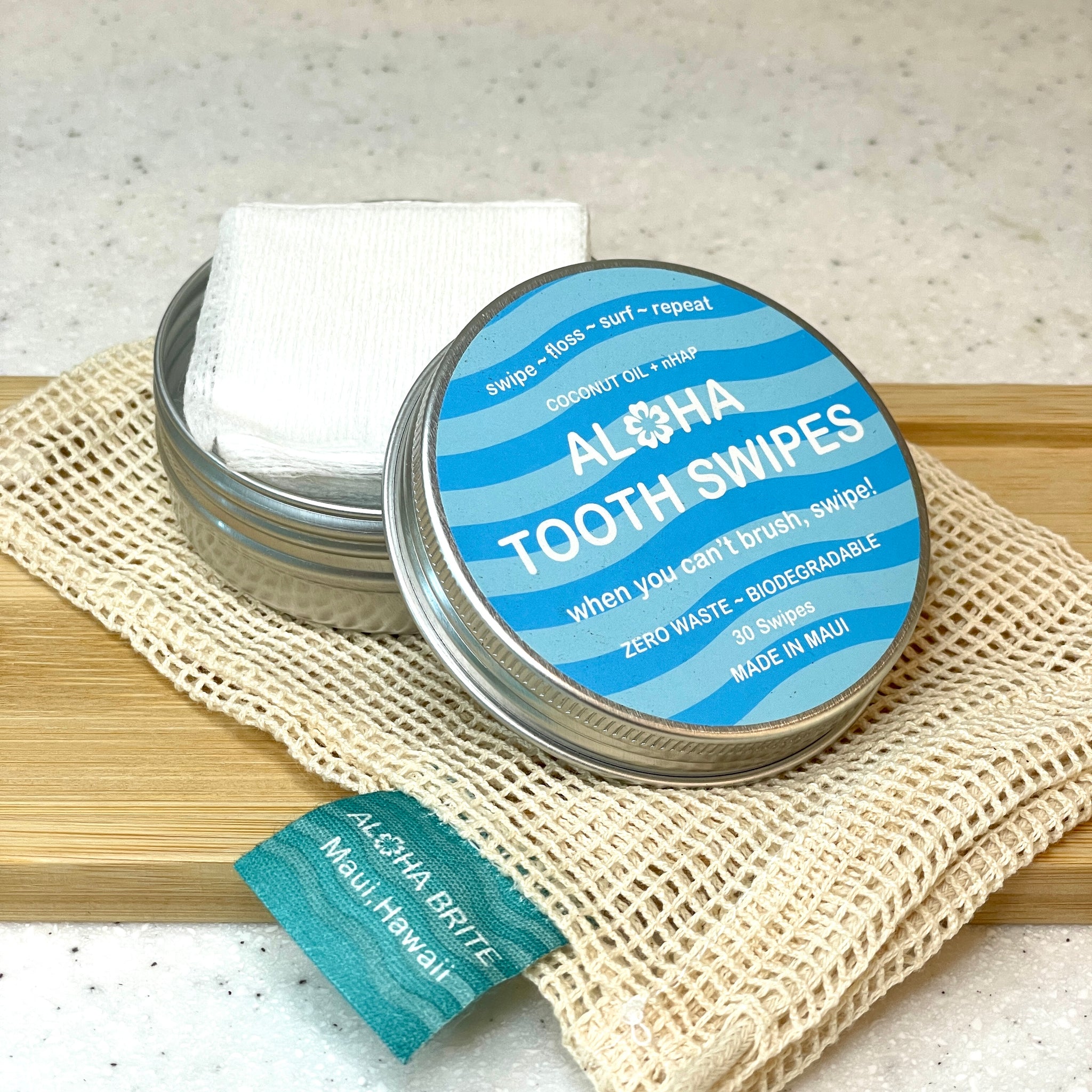 This revolutionary biodegradable swipe is designed to polish teeth while scrubbing away sugars, plaque, and stains/acids (think coffee, tea, soda, kombucha, lemon water - yes they can all stain and erode your teeth if not swiped off quickly!). The infusion of coconut oil and nanohydroxyapatite may also help to reduce bacteria and Brighten the teeth. Swipes are perfect for keeping both your teeth and gums healthy. Zero waste and pure Aloha. Happy Swiping!
