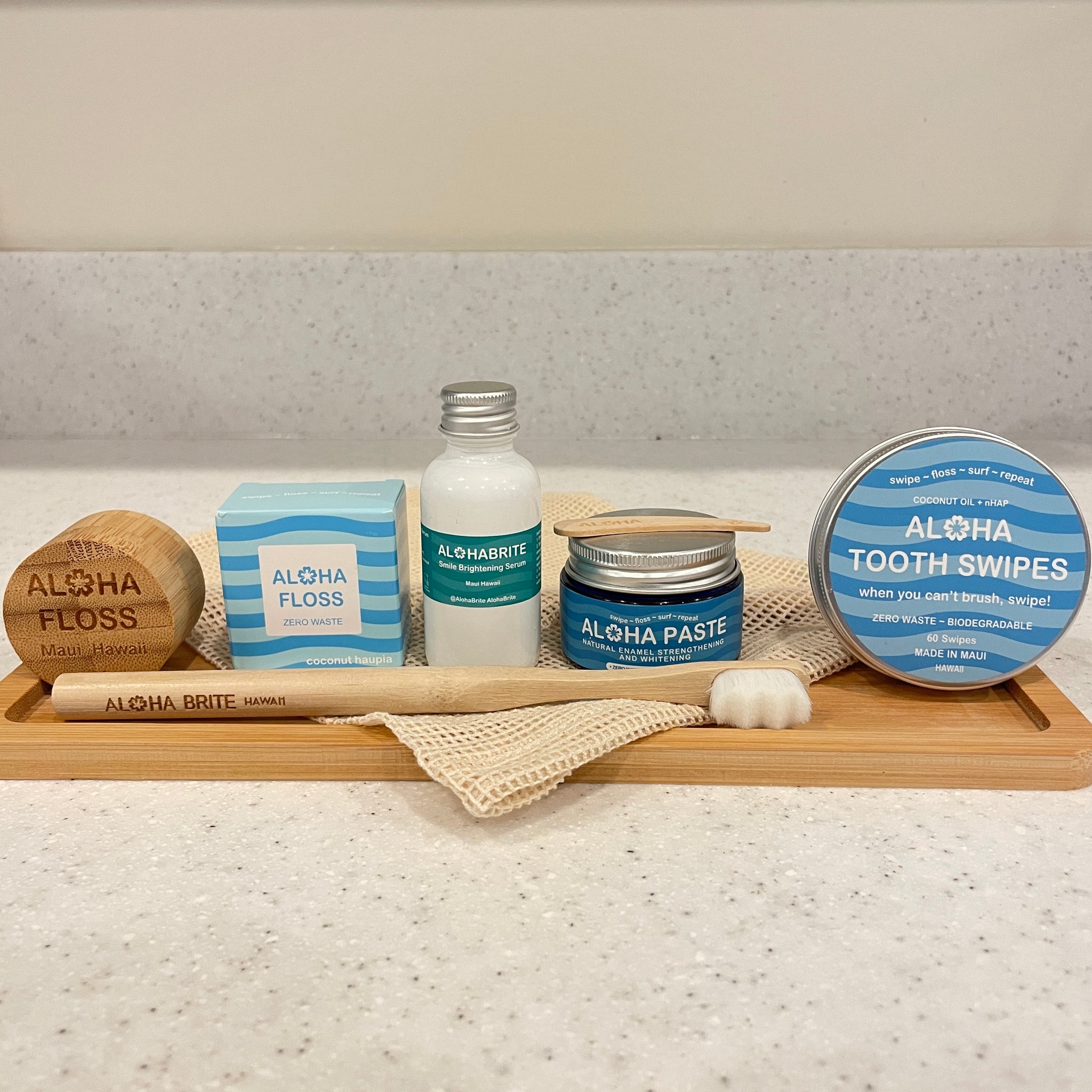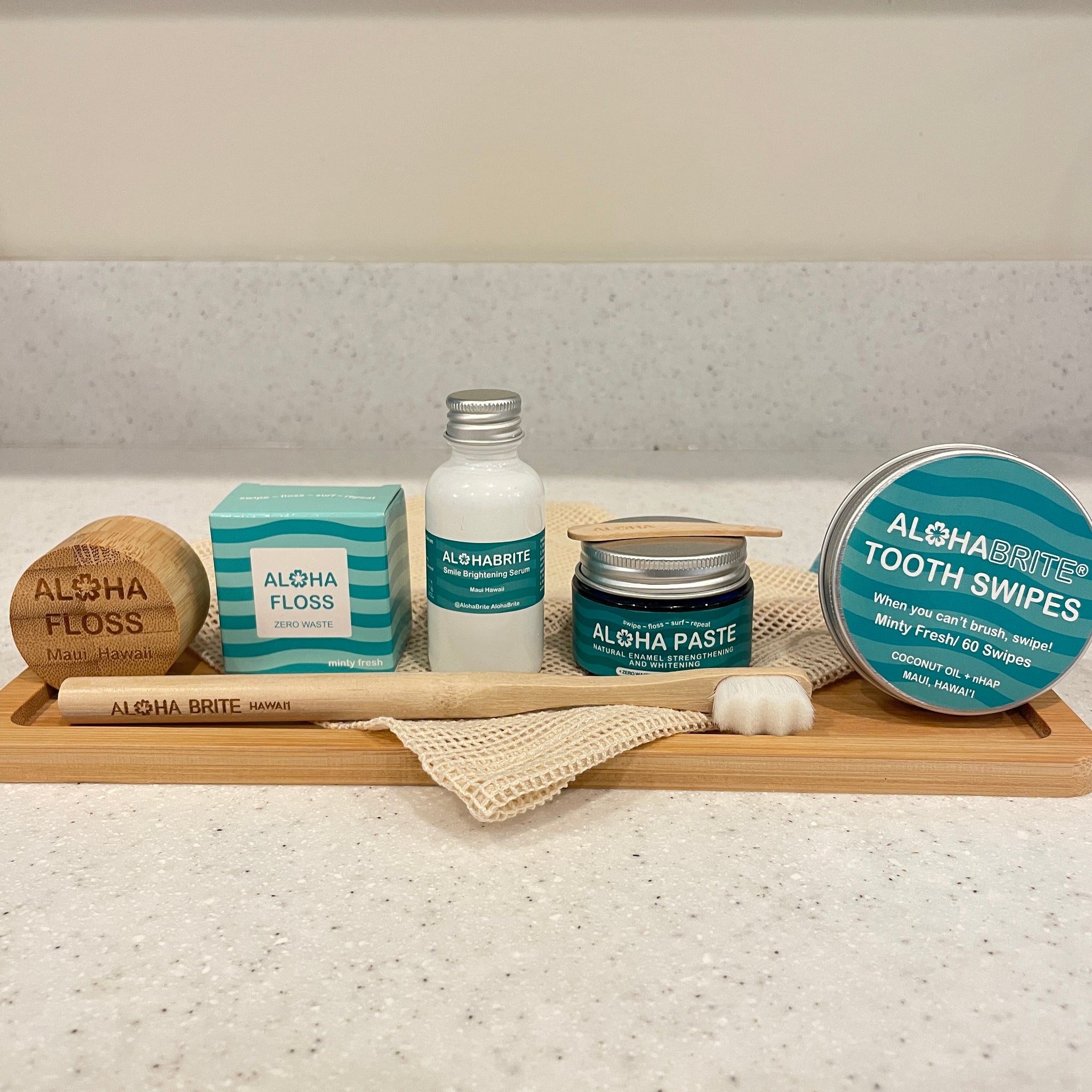 - AlohaBrite Floss with Bamboo Case: Eco-friendly and stylish, this bamboo case holds our premium coconut oil infused floss—making your dental routine sustainable and chic. Plus they’re refillable!